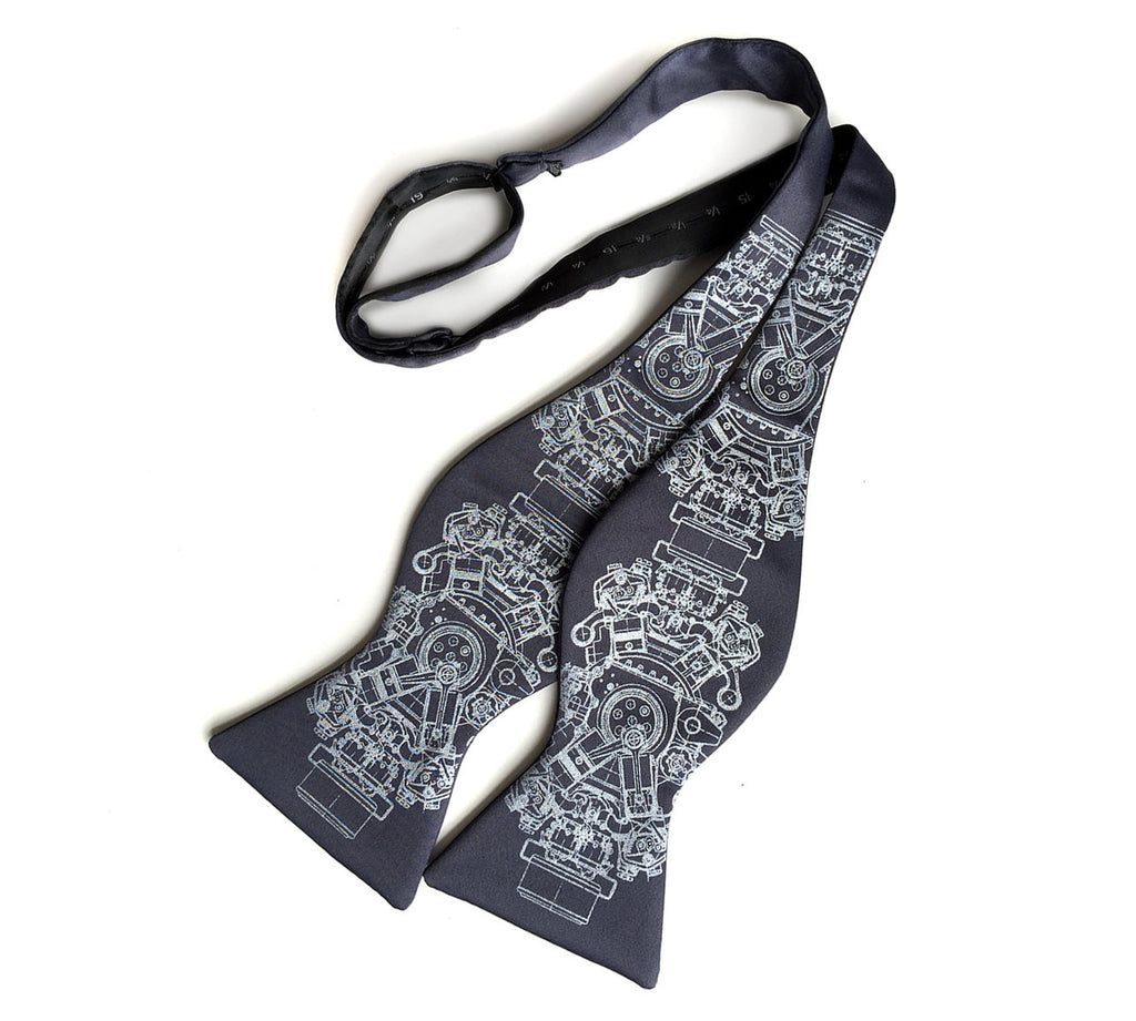 Engine Rosette bow tie. Our motor motif is born from rearranged and tangled car-part schematics - this particular design is from a vintage engine. We think may be just about the most elegant way to show your love for classic cars. Hand-drawn by us, then reflected and flipped - these technical drawings become a subtle abstract lace pattern, perfect for automotive aficionados for even the most formal events! Original illustration.