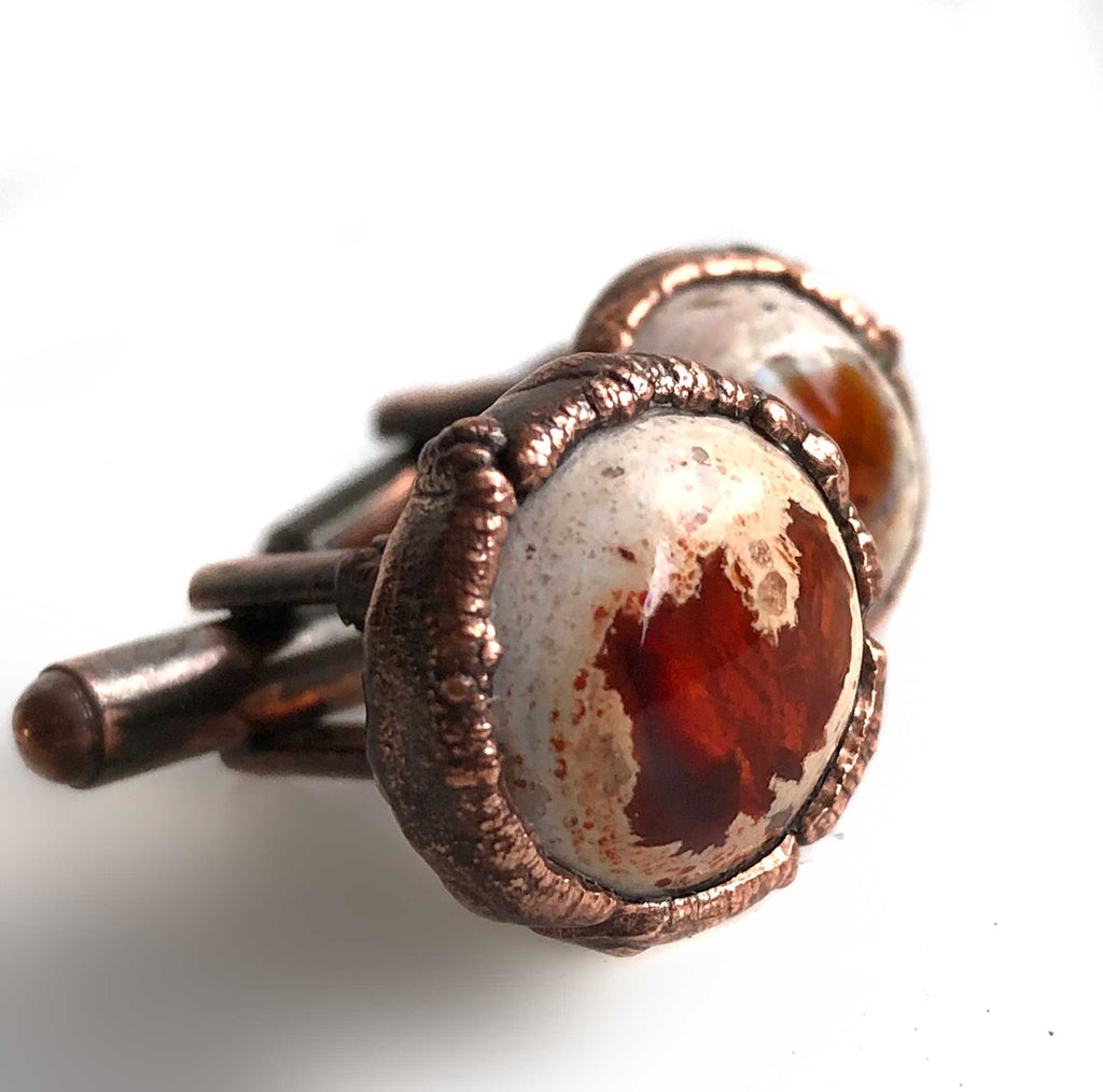 Fire Opal Cufflinks, electroformed gemstone cuff links. Deep, dark, red-orange Mexican "jelly" opal, or flashy precious opal cuff links. All handmade; we love metalworking, copper electroformed by us right in-house!