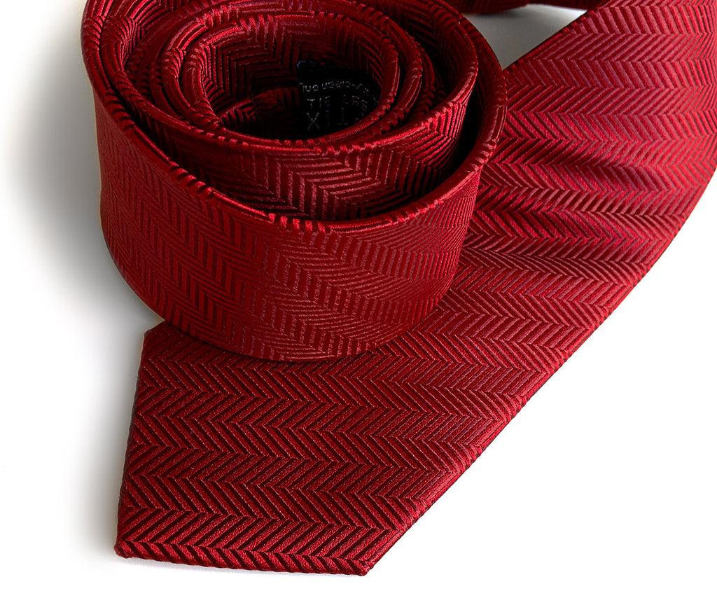Garnet Red Silk Necktie - deep red woven herringbone silk. These come in one perfect "Goldilocks" middle tie size: our narrow, modern slim cut. Not too skinny, not too wide. Just right!