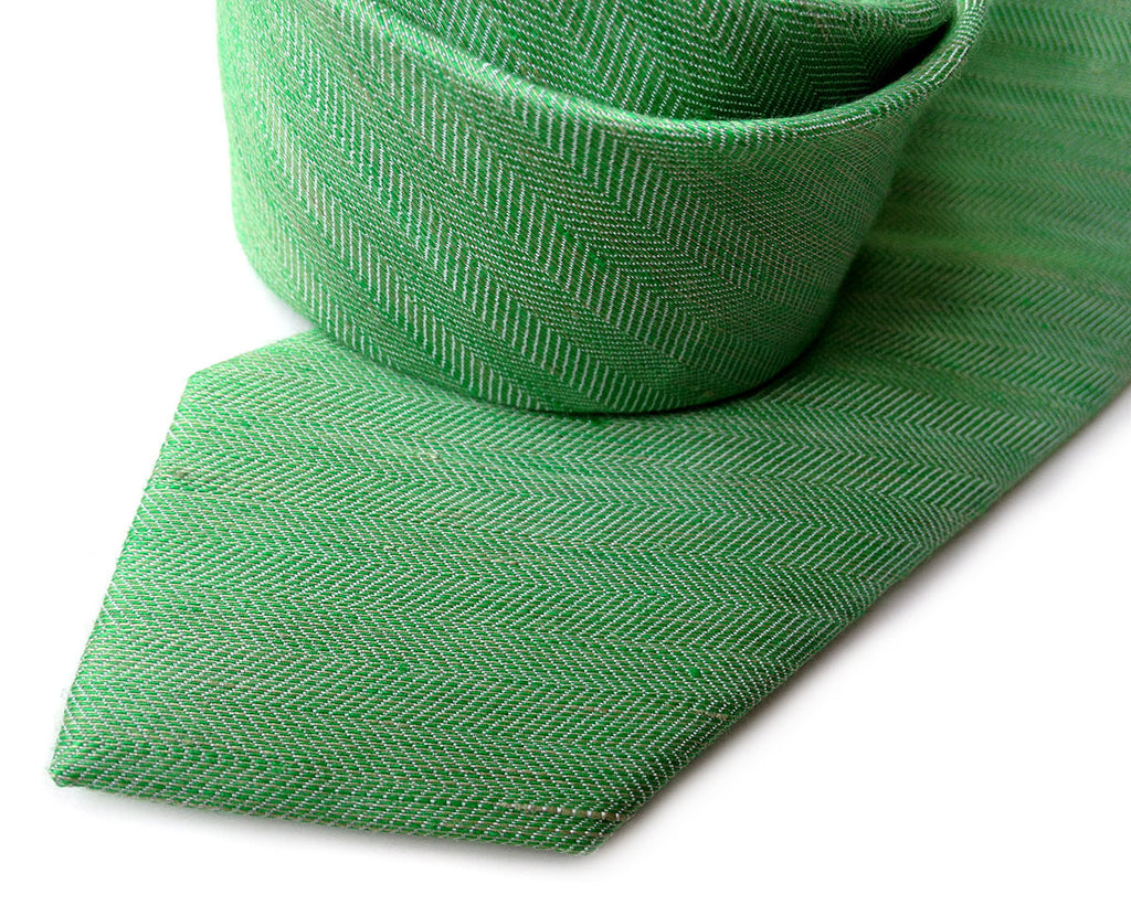 Green Linen Necktie. Solid color tie, "Palmer Park." Our herringbone silk & linen blend necktie. These come in one perfect "Goldilocks" middle tie size: our narrow, modern slim cut. Not too skinny, not too wide. Just right! The alternating silk and linen threads in the warp and weft of the fabric are each very light and very dark, when seen together make an extraordinarily unique solid fabric when seen at a distance.
