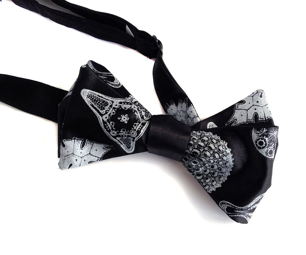 Diatoms Bow Tie. What the heck is a diatom? Looking like little more than white dusty dirt to the naked eye, under the microscope a whole new, staggeringly beautiful universe is revealed! Once the "bones" of seafaring unicellular phytoplankton, intricate, futuristic lace and architectural patterns are created from their silica exoskeleton cast offs. The diatoms adorning this tie are sure to delight the biologist, botanist, chic-est geek or ocean researcher.