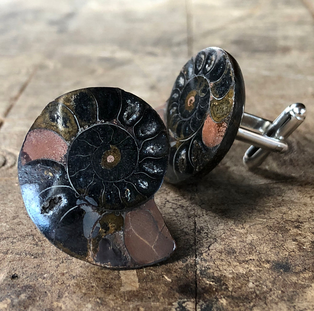 Black Ammonite Cufflinks, golden ratio, men's fossil cufflinks. Handmade by us and Mama Nature herself, no two are ever the same! Very occasionally we come across a rare black ammonite fossil. Early relatives of the modern nautilus, these unique fossils likely got their color from manganese rich waters.
