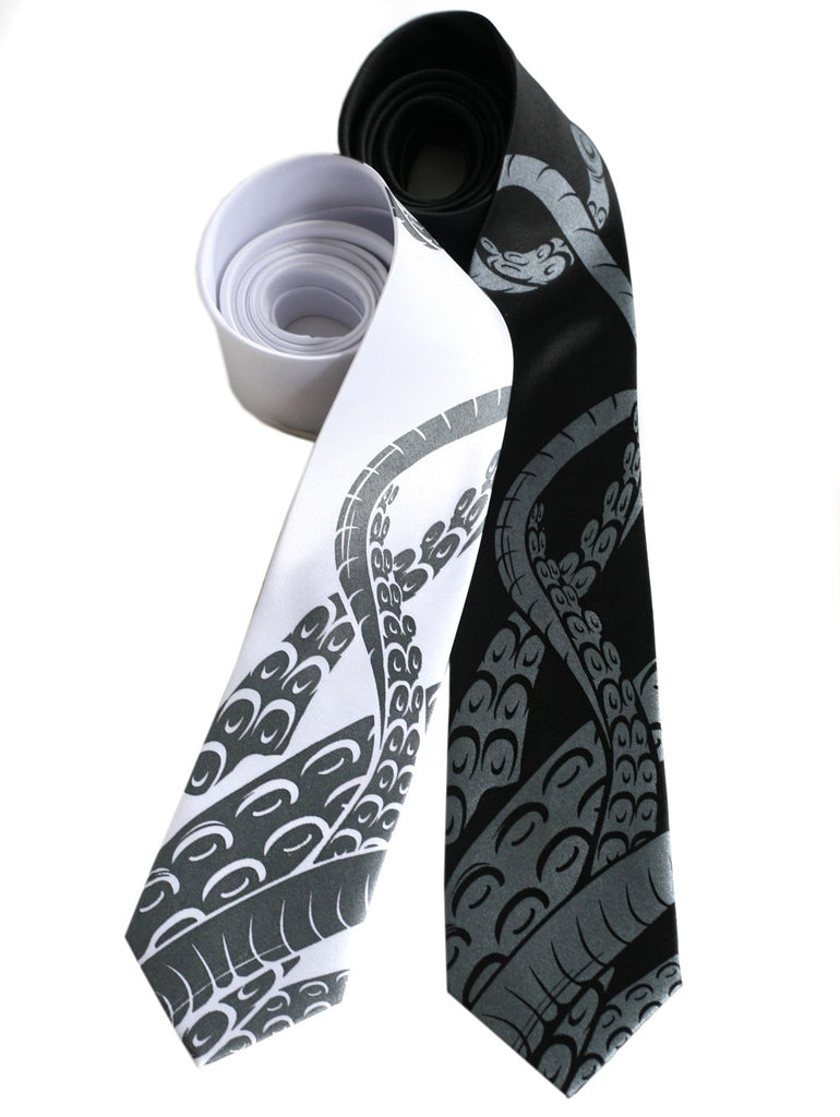 Sucker Necktie. Octopus tentacles tie. Hello Cthulhu? She's got legs! These tentacles just can't wait to get their suckers on you, and cephalopod fans can't get enough eight-legged neckties. Win win! So...we've introduced yet another. This time, our Lovecraftian octo goodness undulates up nearly the entire length of the tie, so a tentacle will peek out even when wearing a jacket or vest.