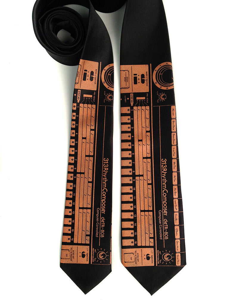808 Drum Machine necktie. Inspired by the iconic Roland TR-808, we painstakingly drew a technical drawing, with a few extra Easter eggs, from one of our Detroit pal's real 808. You need MORE COWBELL!