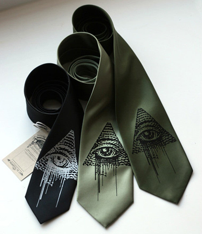 Based on a tiny detail from the US One Dollar Bill, and much discussed by conspiracy theorists, the "All-Seeing Eye" or "Eye of Providence" adorns the front of this tie. Masonic lore or Founding Father's watchful Godlike eye? This one is crying. A lot. Or bleeding profusely. Read into it what you will.