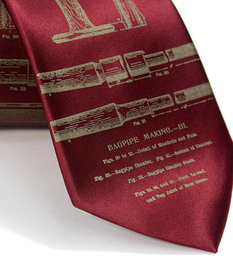 Bagpipe making instructions necktie - adapted from a set of 1908 DIY bagpipe making plans. The 11th day of Christmas, we get pipers piping - don't ever malign a piper, a set of pipes, or this tie! No pipes in hand? Be the life of your holiday party without having to make a sound.