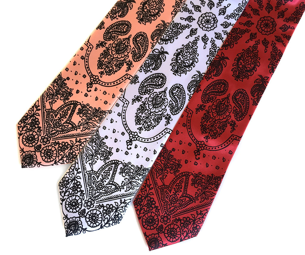 Bandana Print Silk Necktie. Paisley print men's tie. Such a simple piece of decorative cloth has quite a storied history through both fashion, counter-cultural symbol and it's use as a utilitarian item. We've reworked it's shape so it can be donned for business and party. Howdy partner!