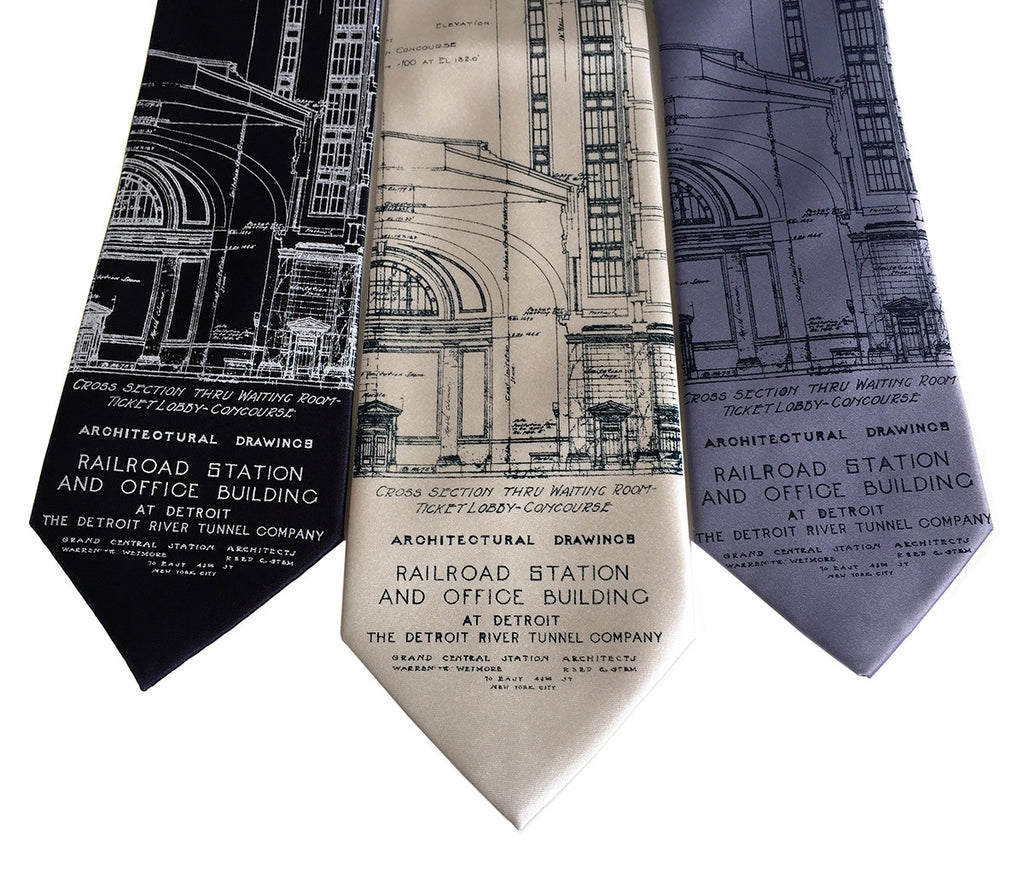 Detroit Train Station Blueprint Silk Necktie. Michigan Central Station tie. In order to give you a clearer representation of our beloved historic landmark, the architectural image was painstakingly digitally restored by us (for you!) right here at the 'Lab, from the original 1912 blueprints.