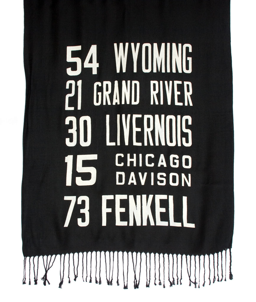 Bus Scroll Pashmina: Detroit West Side Route scarf. From our series of Detroit neighborhood and landmark-specific neckties and scarves. This historically-themed bus roll scarf lists some of Detroit's most notable West Side routes. This print has five names and accompanying route numbers, including: Wyoming, Grand River, Livernois Chicago Davison and Fenkell.