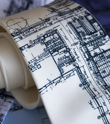 Architect's Blueprint Silk Necktie. Detroit's Cass Technical High School. Illustration from original 1917 blueprints.