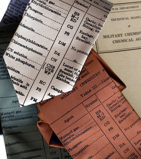 Chemical Warfare Necktie. The text image is derived from an excerpt in the 1942 book, "War Department's 'Technical Manual, Military Chemistry and Chemical Agents'". We're fortunate that Detroit junk shops are a treasure trove of once classified military ephemera. Book not included in purchase, but you do get a tie printed with with one of the best pages!