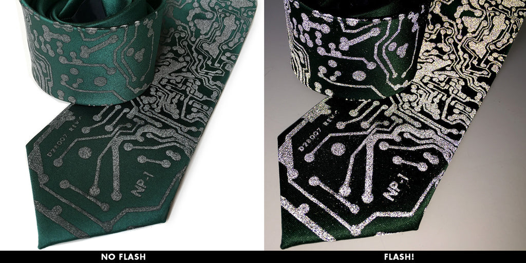 Circuit Board Neckie, Reflective Ink Printed Tie. Our circuit board print ties just got even better - now with retroreflective lens printing ink! You know the fancy pants reflective prints that usually live on your jogging shoes and safety gear? Now you can rock it on a tie! Even more fun? It's a flash photo disruptor! When someone shoots a flash photo, people get blacked out and little else shows up except your AMAZING TIE. Haha, prankster.