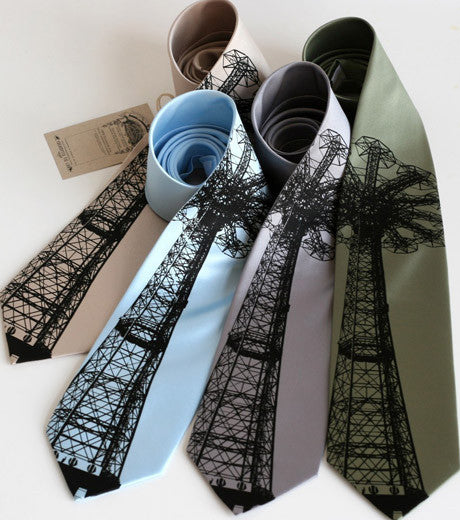 Coney Island Parachute Jump Necktie. Now a registered landmark, The Coney Island Parachute Jump (a.k.a. The Eiffel Tower on Brooklyn ) was originally built for the 1939 New York World's Fair. In 1941 the structure was moved to its current beloved site, then part of the Steeplechase Park amusement park. Although the ride stopped operating in 1968, it is still one of the most iconic structures in all of Brooklyn.