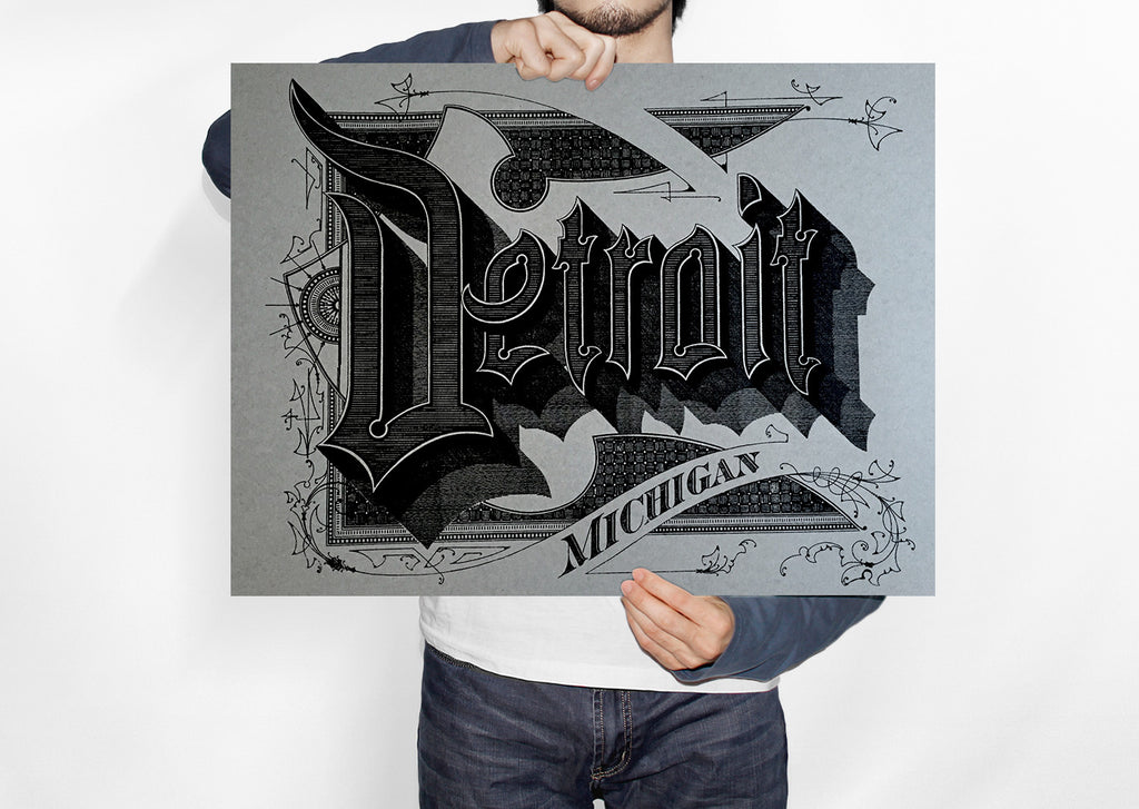 Detroit Screen Print Poster. "Roaring 20s Script" Art Print. 19 x 25 inches, hand-pulled silkscreen print. Designed and printed by hand in our Detroit, Michigan studio. Painstakingly re-drawn from a graphic fragment found in an illustrated 1920s Detroit Map. Shown: Black printing ink on medium grey, cream and bright white.