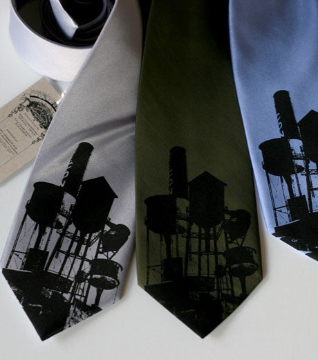 Water Towers Necktie. A perfect homage to 19th century architecture, whether you love New York City's iconic water towers or prefer those high atop structures in your own home town. This design is born from our own photos of Detroit's historic industrial and automotive factory water towers, combined into one illustration.