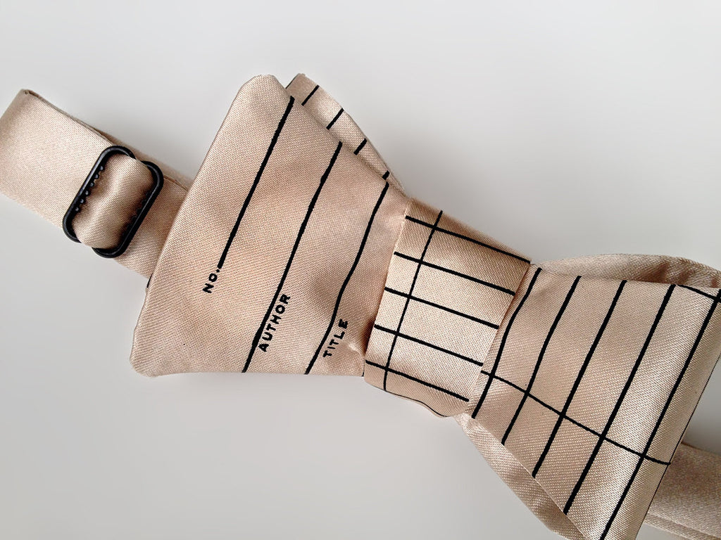 Library Book Bow Tie. Due date card bowtie. Always punctual? Bring those books back on time! The fifth in our series of vintage paper emulation bow ties, we present to you, our date due slip bow tie, because you've got the Write Stuff. Not a fan those new laser scanning contraptions? Books over laptops or tablets? We have nostalgia for the good ol' paper, and think you should too.