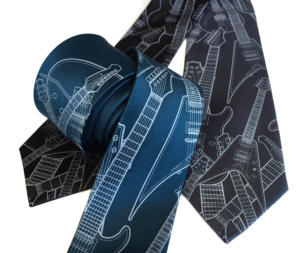 Electric Guitar Necktie. You can rock out... with your tie out! We've seen some snooze-worthy guitar ties in our decade of experience as tie-makers...this one is a little more fun, because you demand it. And METAL. Get a perfect gift for that hard to buy for guy in a band, guitar teacher or anyone who likes stringed instruments.