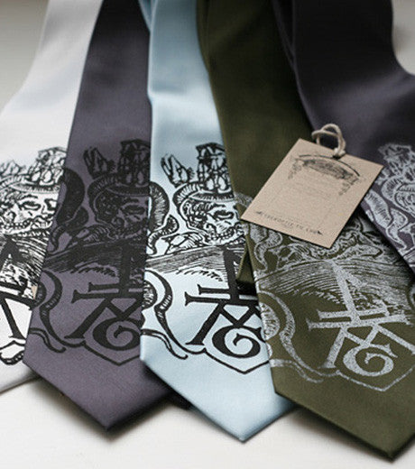 Ex Libris Necktie, Book Print Silk Tie. "From the Library of" - a sixteenth century book imprint with skull, hourglass and intertwined snakes. Bookplates became common in 13th century Europe and typically bore a name, motto, device, coat-of-arms, crest, badge, or any design that signifies ownership of the book.