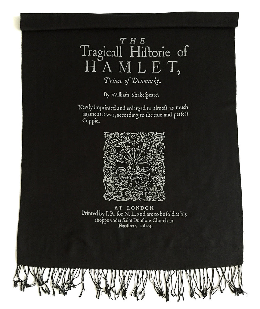 Hamlet Print Scarf. William Shakespeare Book Print Scarf, adapted from the 1604 title page of "The Tragedy of Hamlet, Prince of Denmark," Second Quarto (Q2). Hamlet is Shakespeare's longest play and arguably one of the most influential tragedies in English literature.