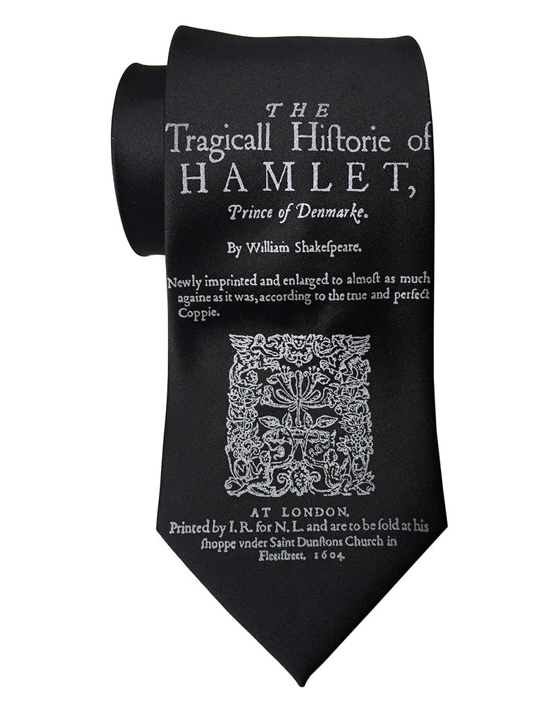 Hamlet Print Silk Necktie. William Shakespeare Book Print Tie, adapted from the 1604 title page of "The Tragedy of Hamlet, Prince of Denmark," Second Quarto (Q2). Hamlet is Shakespeare's longest play and arguably one of the most influential tragedies in English literature.