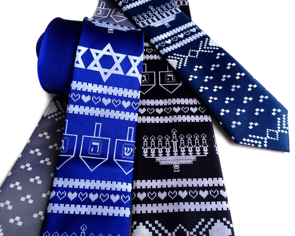 Ugly Hanukkah Sweater Print Necktie. Make bubbie proud. Buck the Christmas Sweater trend, and show that you're better with eight days of presents rather than just one. Ugly Sweater Parties are all the rage, but sometimes you still need to wear a tie. Now you can take that unbridled joy and spirit with you at all times. Really feeling the season? Double up with a sweater and tie. Might lead to double the presents! Hanukkah starts December 18, 2022 for all you Gentiles who might forget. (Hint hint.)