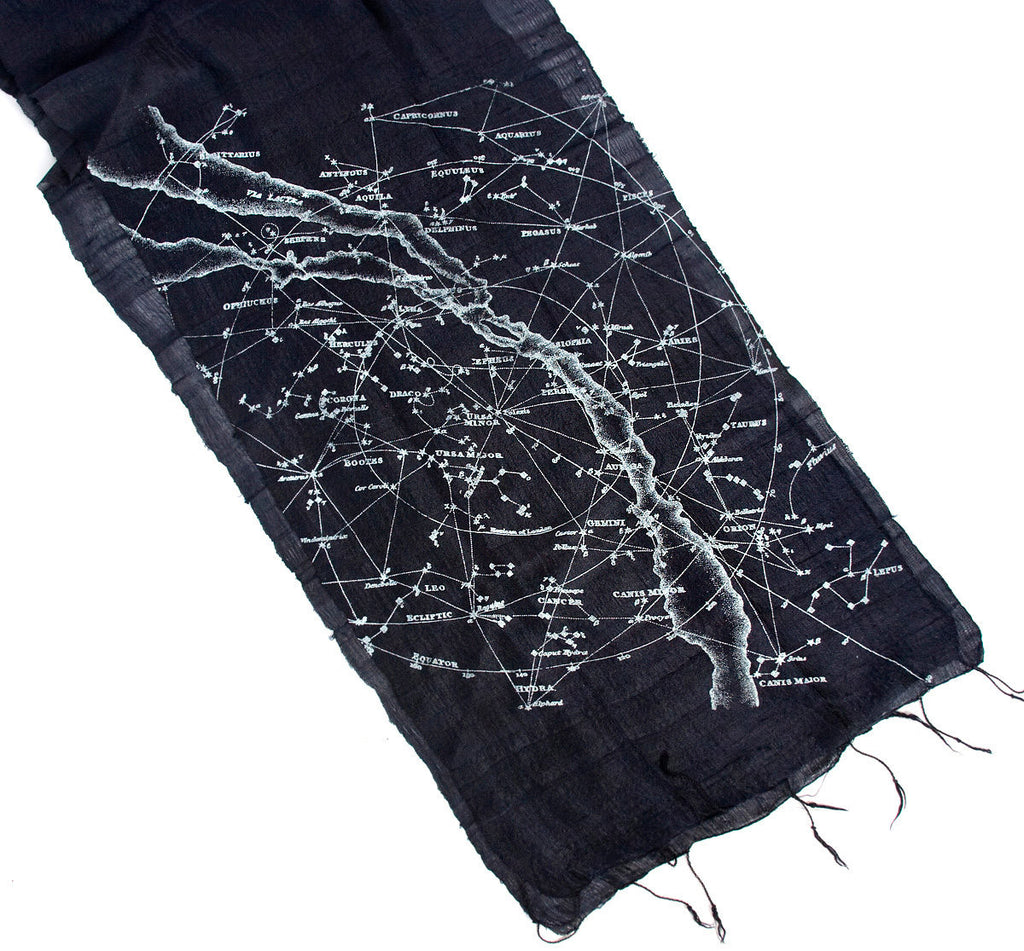 Galaxy star chart silk scarf! Our constellation scarf is a perfect way to let your special starry-eyed someone know that he or she is your Galactic Center. Adapted from an 1822 star chart. "Milky Way" is a translation of the Classical Latin "via lactea" which is seen written directly under "Sagittarius" at the very top of the image.