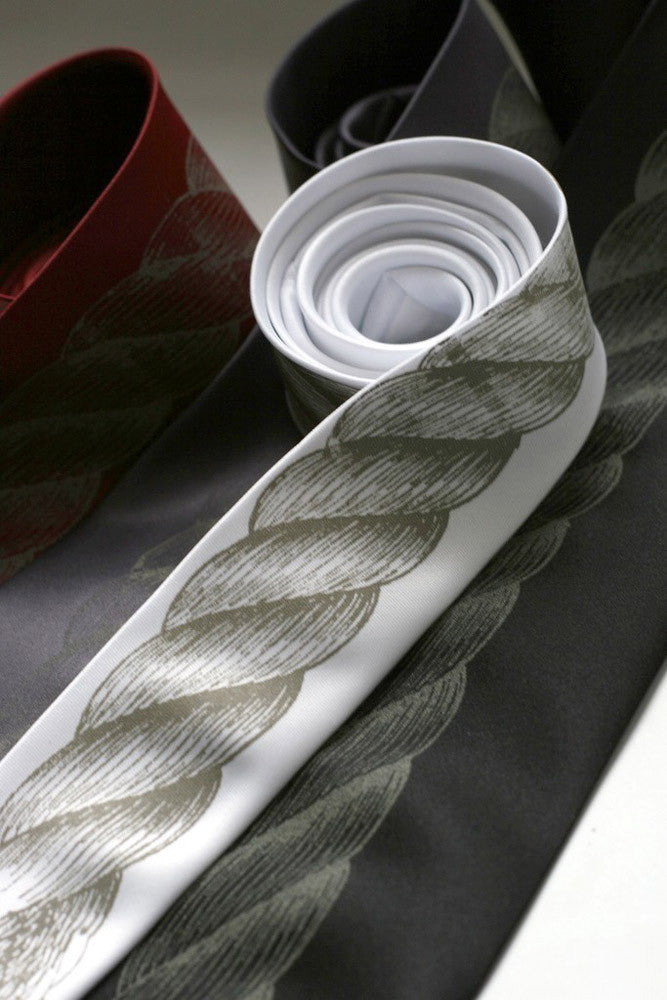Detailed rope print begins where the tie is knotted, so it looks as if you have a nice tidy rope around your neck. Dove grey, white or black ink on a range of colors and widths. We think the skinny version looks best.