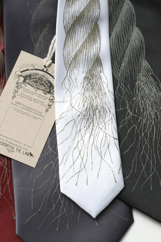 Tired of being a corporate slave? At the end of your rope with boring office attire? Show your true feelings! Don't be A Frayed to. Detailed rope print begins where the tie is knotted, so it looks as if you have a nice tidy rope around your neck. Dove grey, white or black ink on a range of colors and widths. We think the skinny version looks best.