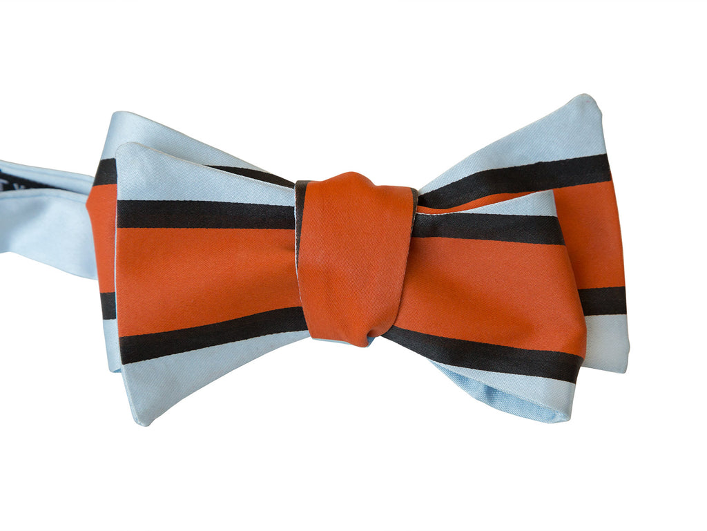Racing Stripes Bow Tie: Le Mans Mirage Print Tie. Inspired by the unmistakable Gulf livery in powder blue and marigold.