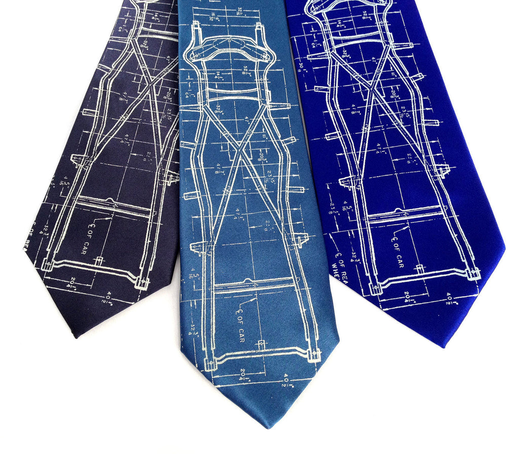 1962 Studebaker Avanti frame necktie. The Avanti was a dramatic departure from Studebaker's previous family sedans. Depicted is the Avanti's frame: the frame is the structural center of any vehicle. An extremely rare vehicle - only about 3500 were ever made in it's single year of production in South Bend Indiana. Perfect for collectors of exotic cars and automotive enthusiasts all around!