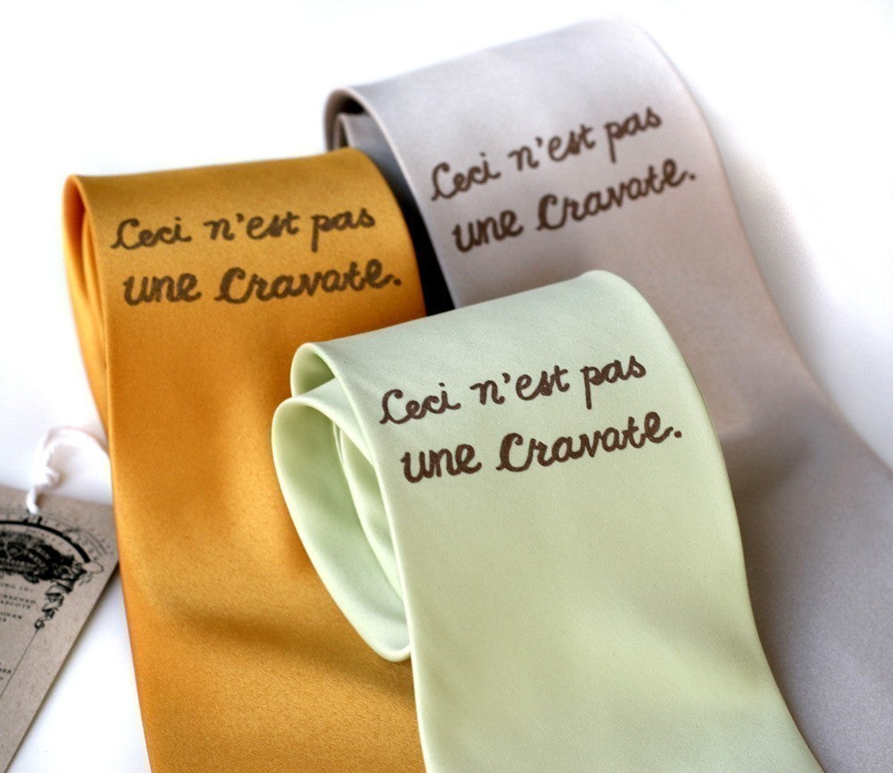 Dadaist necktie. French: Ceci n’est pas une cravate. English translation: This is not a tie. Original illustration, hand-drawn text converted to a screenprint.