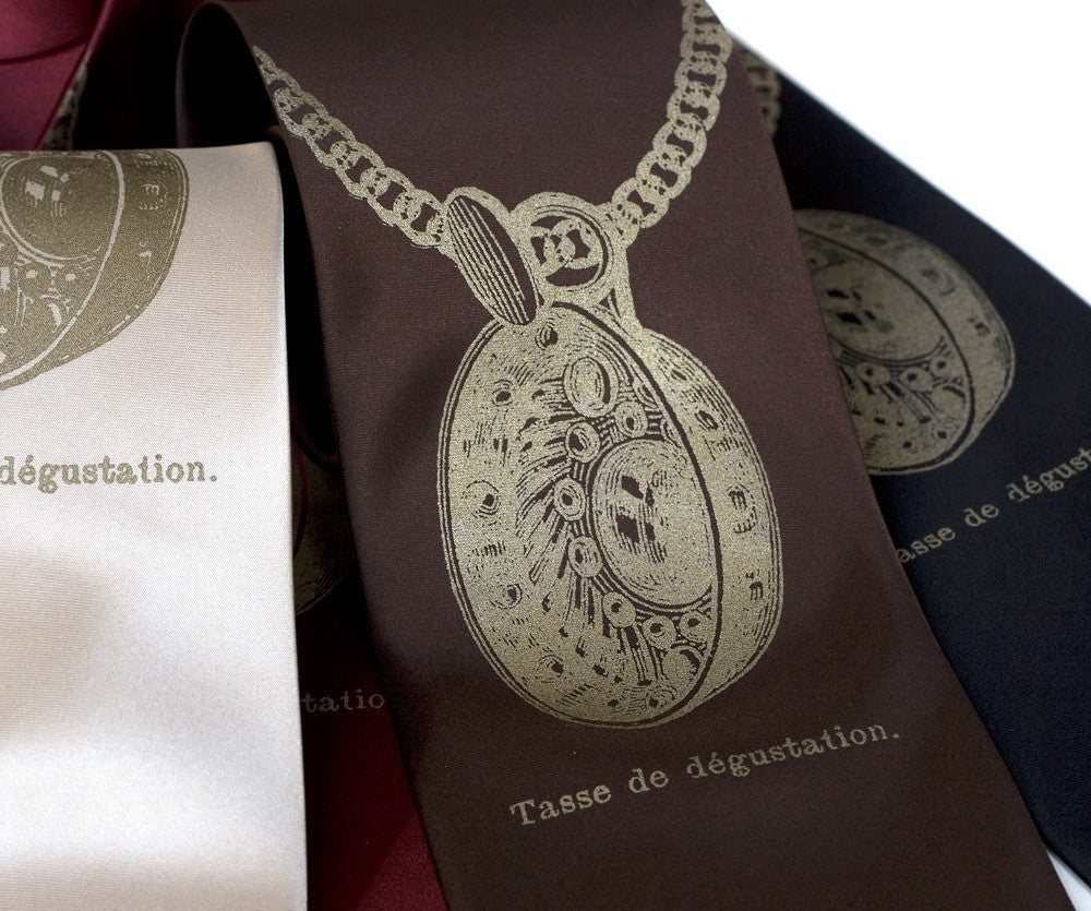 Sommelier Necktie, wine tasting cup tie. The Tastevin, or tasting cup, is the symbol for a sommelier or wine steward. Popular before the advent of electric light, the tastevin's reflective facets would illuminate the true color depth and clarity of wine in dark, candle-lit cellars.