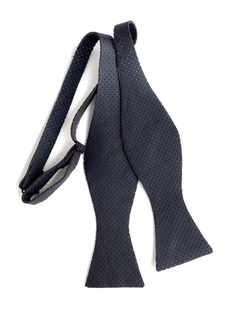 Black Perforated Automotive Leather Bow Tie. Sourced from the off-cuts of automotive seat leather, it is uniquely Detroit! Rugged yet soft textured cowhide with a suede reverse. Laser cut in house for perfect crisp, modern lines. We've carefully selected hides for both fashion and durability - leather ties are meant to not only span the seasons, but decades.