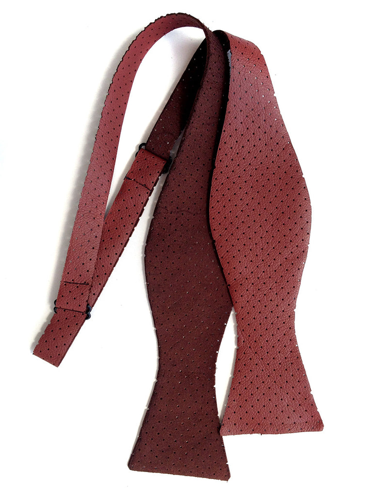 Oxblood Red Perforated Automotive Leather Bow Tie. Sourced from the off-cuts of automotive seat leather, it is uniquely Detroit! Rugged yet soft textured cowhide with a suede reverse. Laser cut in house for perfect crisp, modern lines. We've carefully selected hides for both fashion and durability - leather ties are meant to not only span the seasons, but decades.
