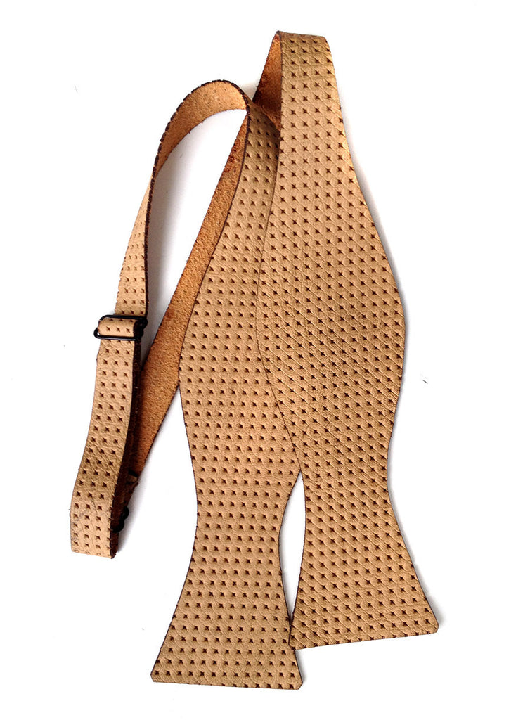 Tan Embossed Automotive Leather Bow Tie. Sourced from the off-cuts of automotive interior leather, it is uniquely Detroit! Rugged yet soft textured cowhide with a suede reverse. Laser cut in house for perfect crisp, modern lines. We've carefully selected hides for both fashion and durability - leather ties are meant to not only span the seasons, but decades.