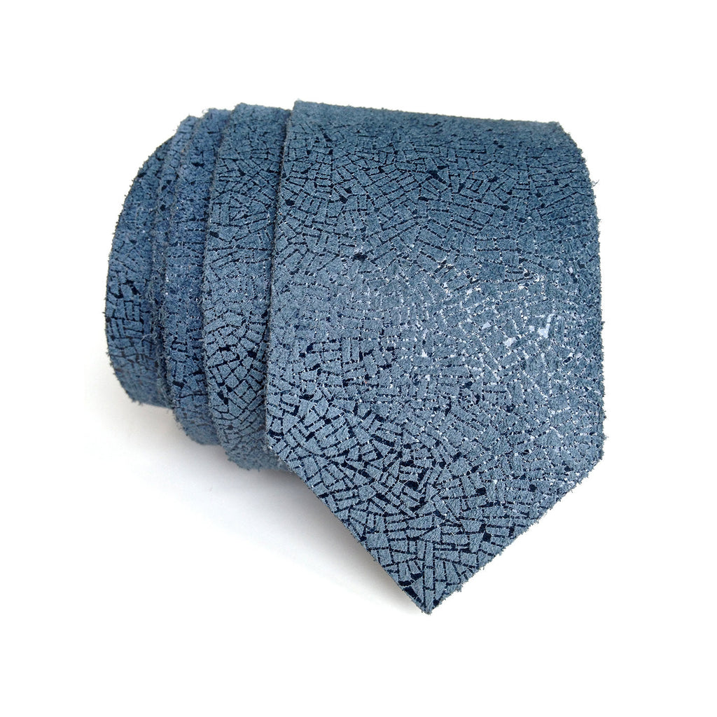 Blue Shatter Foiled Leather Necktie. Sourced from the highest grade Italian upholstery leather. Laser cut in house for perfect crisp, modern lines. We've carefully selected hides for both fashion and durability - leather ties are meant to not only span the seasons, but decades.