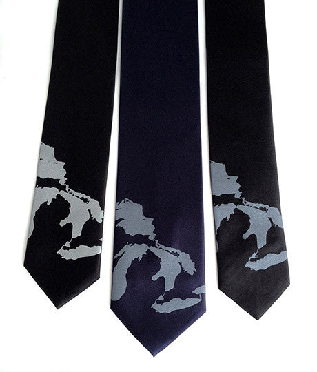 Great Lakes Map Print Necktie. Show your love of the best fresh water in the world! Made right here, in Michigan. Original illustration from ye olde paper maps of Lakes Michigan, Huron, Superior, Ontario and Erie.