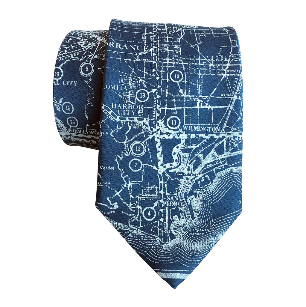 Los Angeles County Map Necktie. Old California Map Print Tie. No one may walk in LA, but neckties sure move the La La Land dapper set! Hollywood-theme wedding? Oscar or Academy Award party? We got you. Safely tie one on and see the city in style without ever sitting in traffic - adapted from a 1934 Highway Transportation Survey Map.