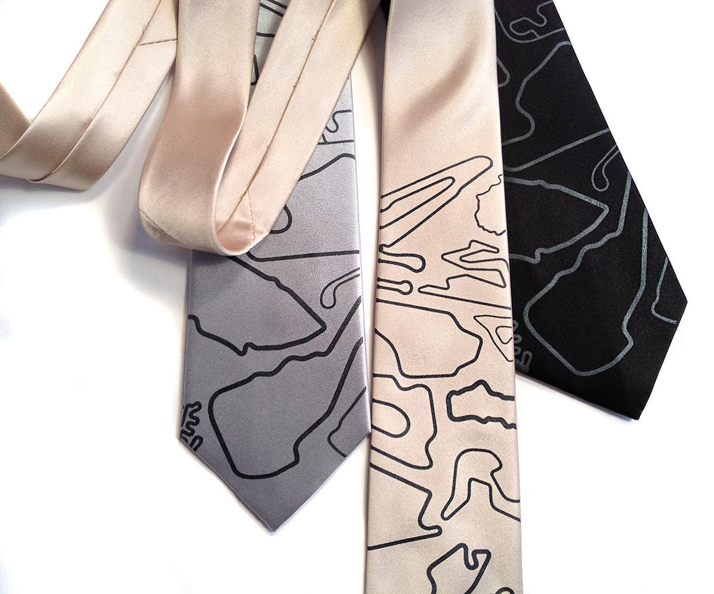 Race Track Maps silk necktie: guaranteed to delight all automotive and racing enthusiasts! In a camouflage like pattern, we present a mash-up of some of the world's most famous racetracks (and a few vintage and obscure), including circuits that host 24-hour endurance racing, drag racing, Grand Prix, Formula One, Professional SportsCar, SCCA and Indycar events. Whether you can name every track shown or simply enjoy the abstract pattern, take pleasure in showing your love for motorsports even at the most elegant of affairs! Original illustration.