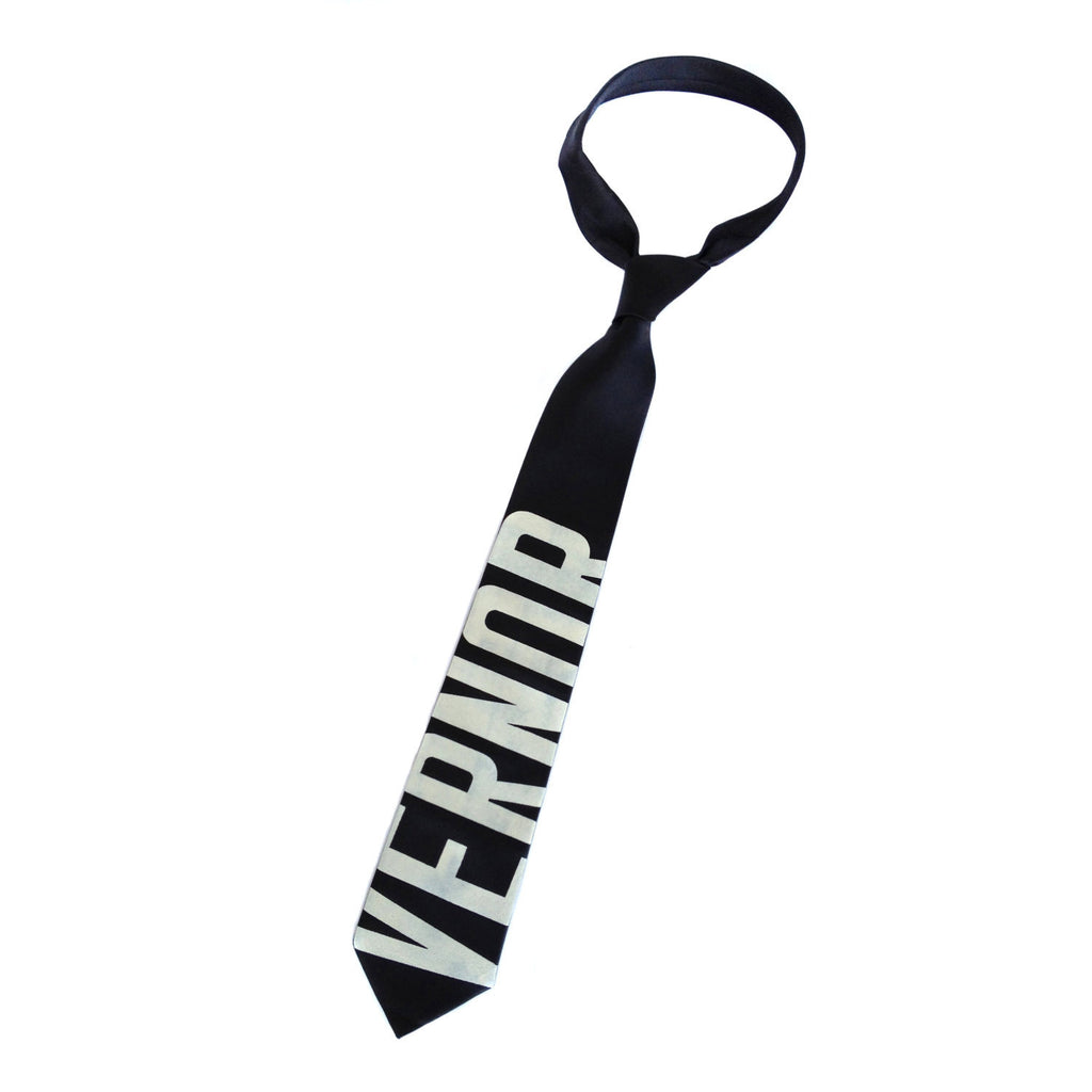 This print extends mid-way up on the tie, approx. 15" from the bottom point; can be seen from under a vest or jacket depending on how it is tied - or concealed if you prefer. *Please note there is some translucency in the ivory-cream printing on black - to be faithful to the appearance of the original sign.