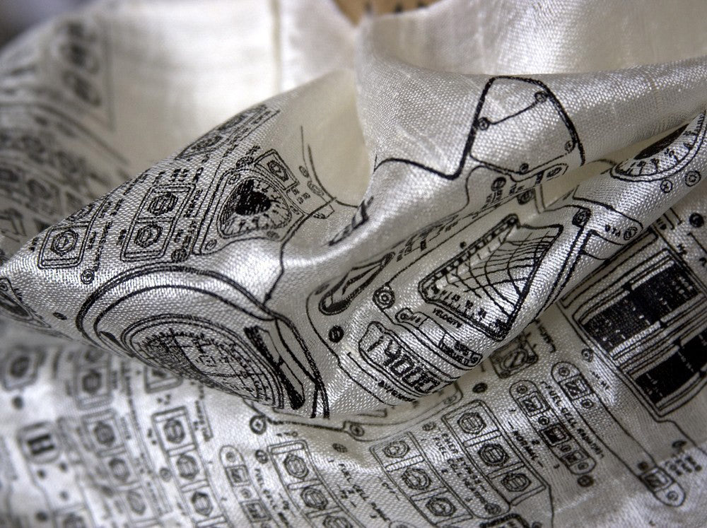 [It's not] Rocket Science! Lean to fly the Apollo Program module simply by looking down at your scarf. Granted we've taken quite a few artistic liberties by moving around the most interesting looking dials and switches to suit the vertical shape, so maybe to be safe, get a copy of the actual manual if you're going to fly your own reproduction moon lander. But this will sure help! Nearly every control in all of the cockpit is shown here.