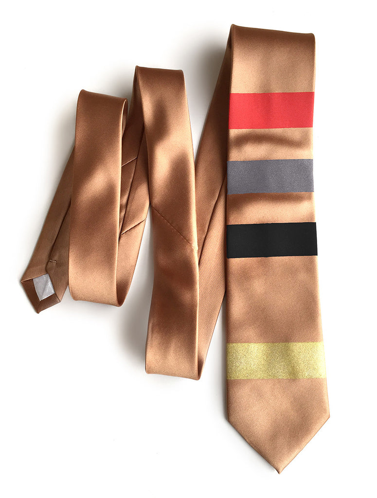 Resistor Code custom color silk necktie. Here is where you can make a four band selection of you're very own, we know how important your own personal values are. To those who don't know, when seeing this tie in action, it's a nifty mod-striped necktie. To those who do, it is some perfect minimalist geekiness. How can you resist!? What is your tolerance? Examples are shown on pale copper and sky blue tie fabrics - but you're welcome to get crazy and select whatever color tie fabric you'd like from the list.