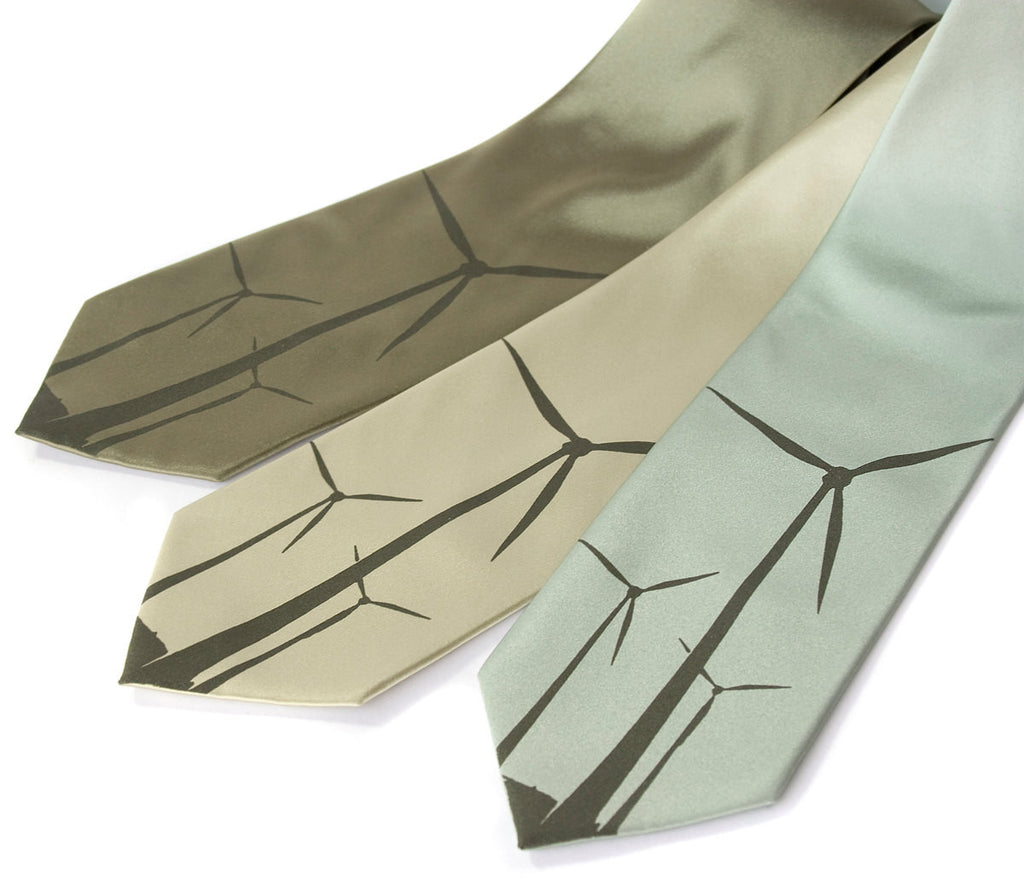Wind Turbine Silk Necktie. Windmill tie. Three wind turbines adorn the tip of this necktie - perfect if you have a preference for alternative energy or just admire the minimalist beauty of the windmill shape.