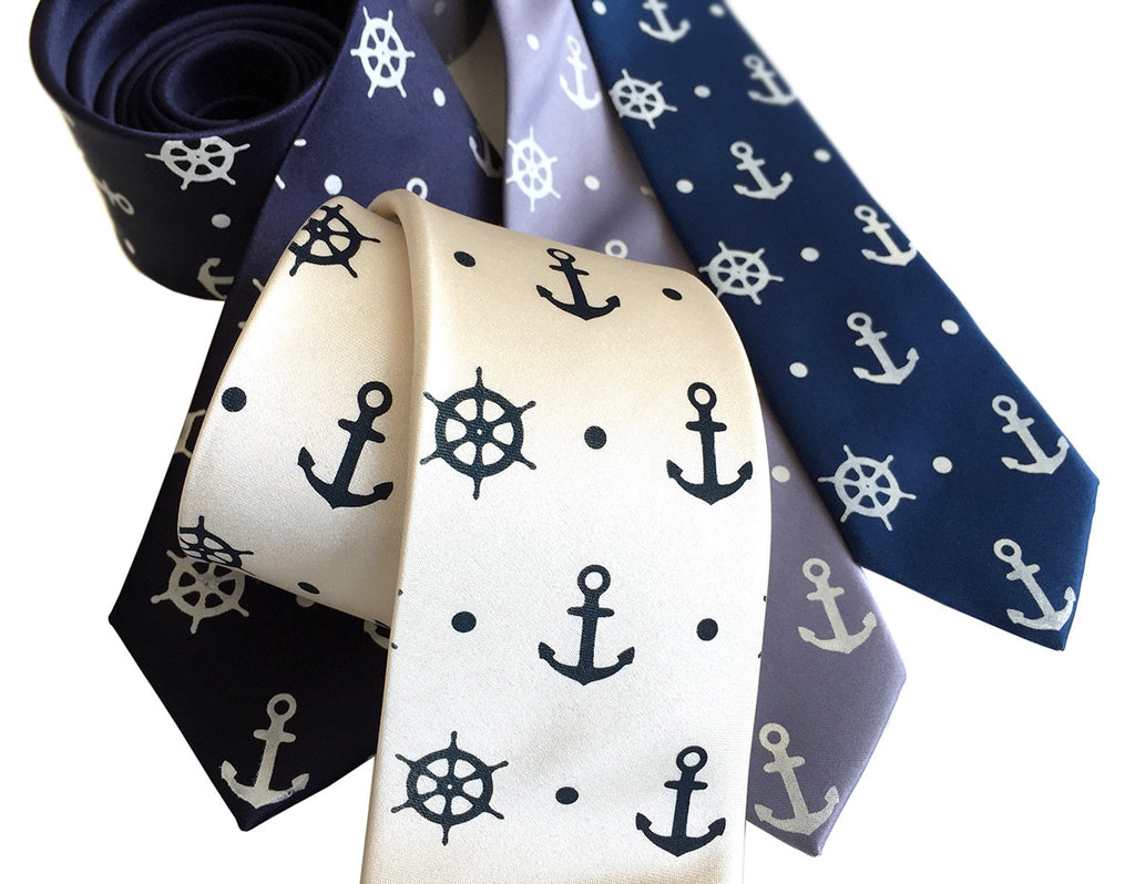 Anchor Necktie. Anchor & Ship's Wheel Blue Nautical Tie. What lies at the bottom of the ocean and twitches? A nervous wreck! Hey there sassy sailor, don't be that guy. Has your old, navy blue tie walked the plank? Take the helm, it's time to freshen up that nautical wardrobe, we're here to help you get those threads back on course.