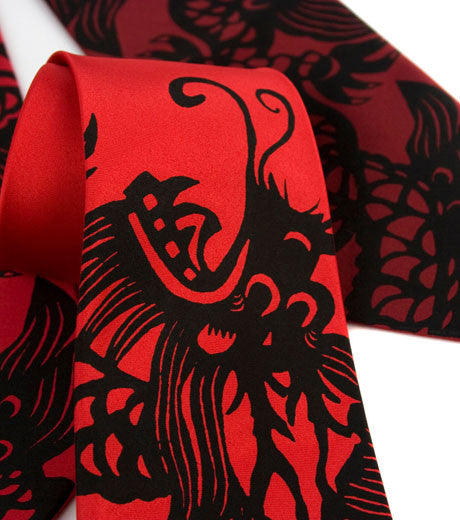 Chinese Dragon Necktie. Dragons bring exceptional, unprecedented achievements. While the Dragon Year comes every 12 years, the lucky dragon also switches between 5 elements. Our lucky dragon is painstakingly cut to resemble that of cut paper lanterns - down to his wee eyelashes.