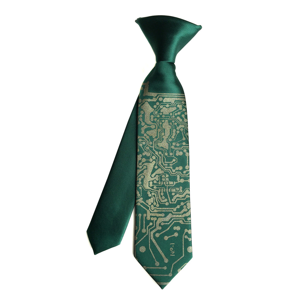 Circuit Board printed kids tie. Short Circuit boys clip-on necktie. For kids as rad as dad! Shown first in antique brass print on emerald toddler size. Next: toddler size next to an adult standard size tie.
