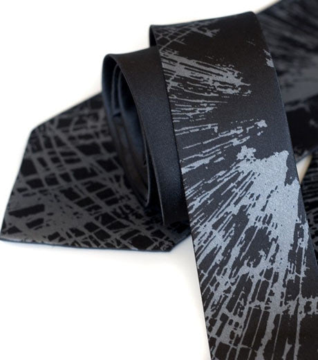 Shattered Glass Silk Necktie. "Crash" tie. A spiderweb pattern simulates broken glass. Inspired by J.G. Ballard's novel, "Crash" and the Normal's "Warm Leatherette." Subtle and elegant tone-on-tone colorways.