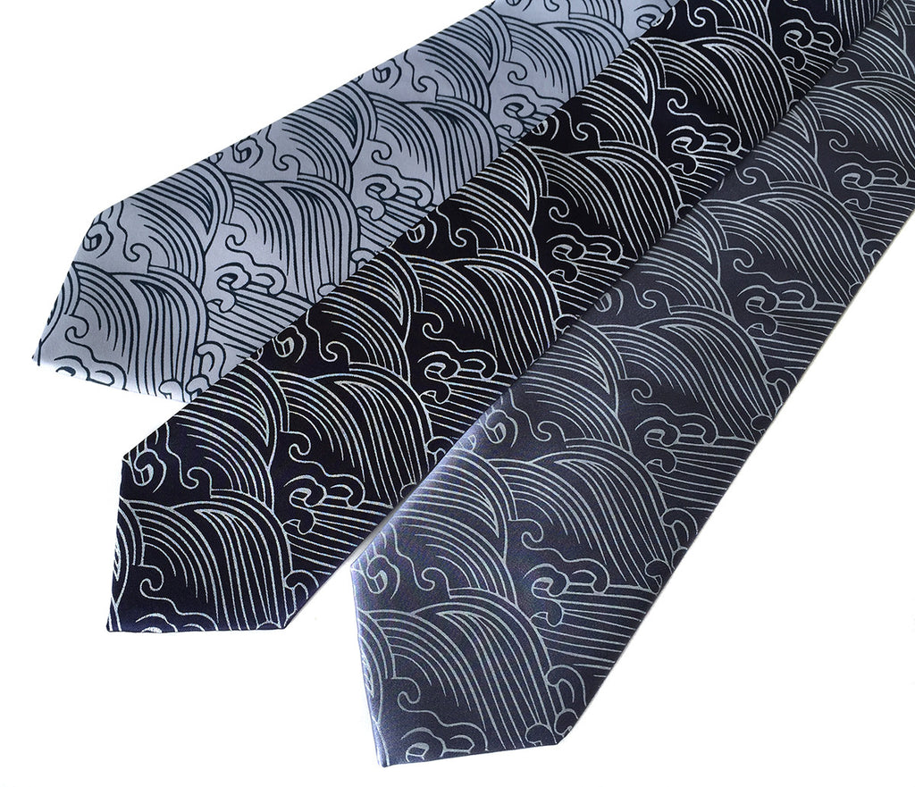 Crashing Waves silk necktie. Japanese nautical print tie. Inspired by the forms and color combinations used in sashiko stitching on vintage indigo textiles, we have re-imagined the art of functional embroidery through silkscreen. Original illustration.