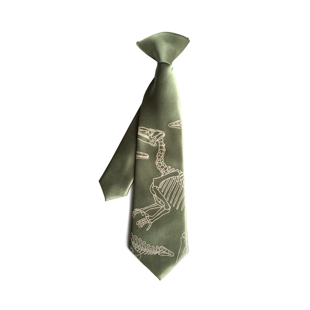 Dinosaur Bones kids necktie. Boys clip-on necktie. For kids as rad as dad! Shown first in warm cream on sage green toddler size. Next: olive toddler size next to an adult standard size tie.