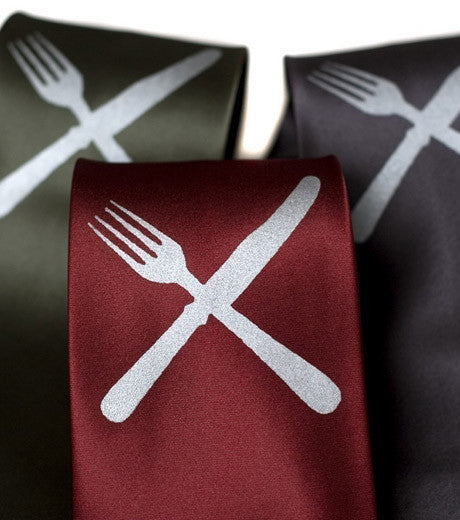 A simple, minimalist crossed knife and fork adorn this necktie - perfect for the chef, foodie or cook in your life, or just to wear at a fantastic dinner. A well prepared meal is love!